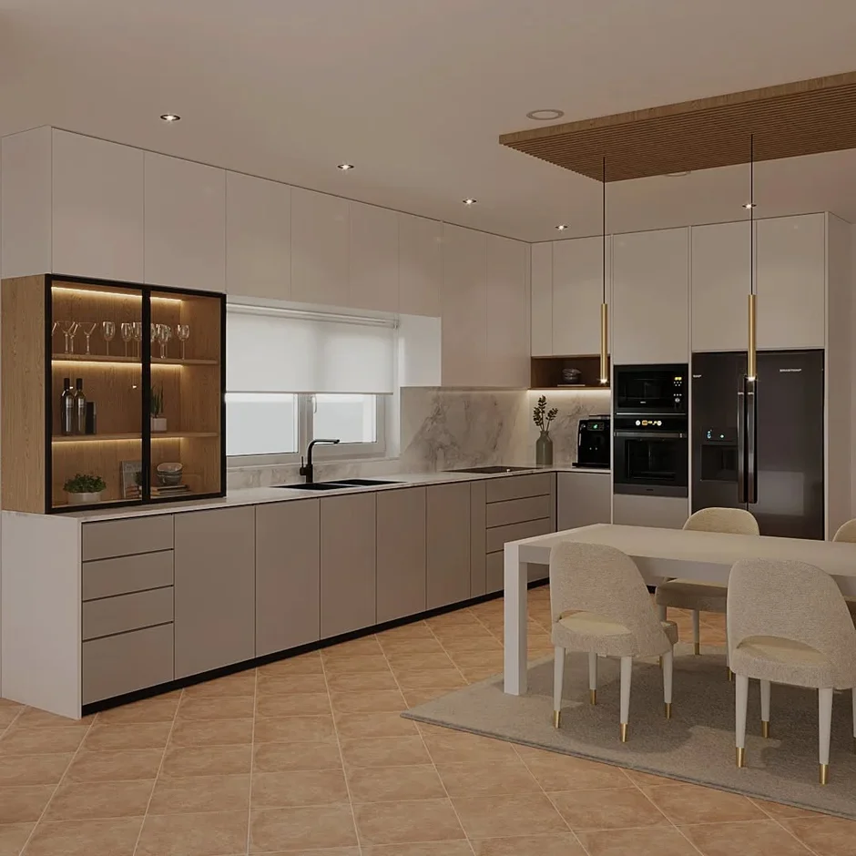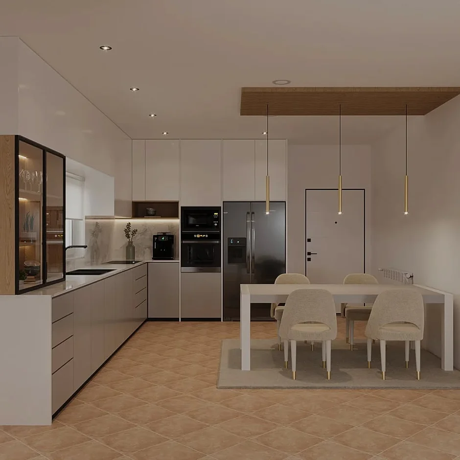 For this project, our team completed a full renovation of a spacious kitchen and dining area, designed in a refined modern style with an emphasis on clean lines, warm neutral tones, and functional elegance. The space combines contemporary materials with carefully planned lighting to create a bright, comfortable, and highly practical environment for everyday living.