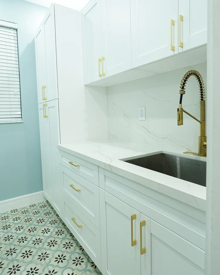 Added brushed brass handles, pulls, and faucet fixtures to introduce warmth and contrast against the neutral cabinetry and stone surfaces. -