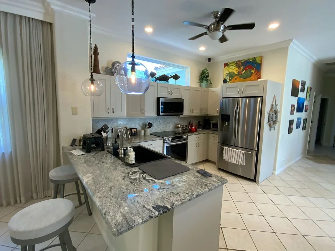 Installed oversized matte-black pendant lights above the island, complemented by recessed LED ceiling lighting to provide layered illumination and visual balance. -