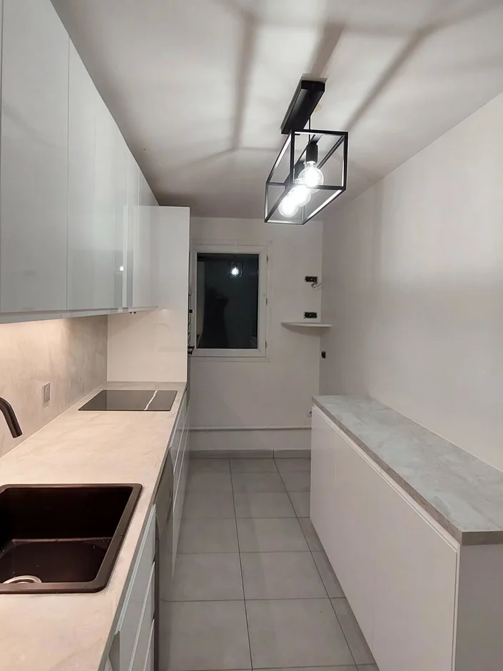 This renovation transforms a narrow galley kitchen into a bright minimalist space, blending glossy white finishes with soft concrete textures to achieve a clean, modern, and highly functional layout.