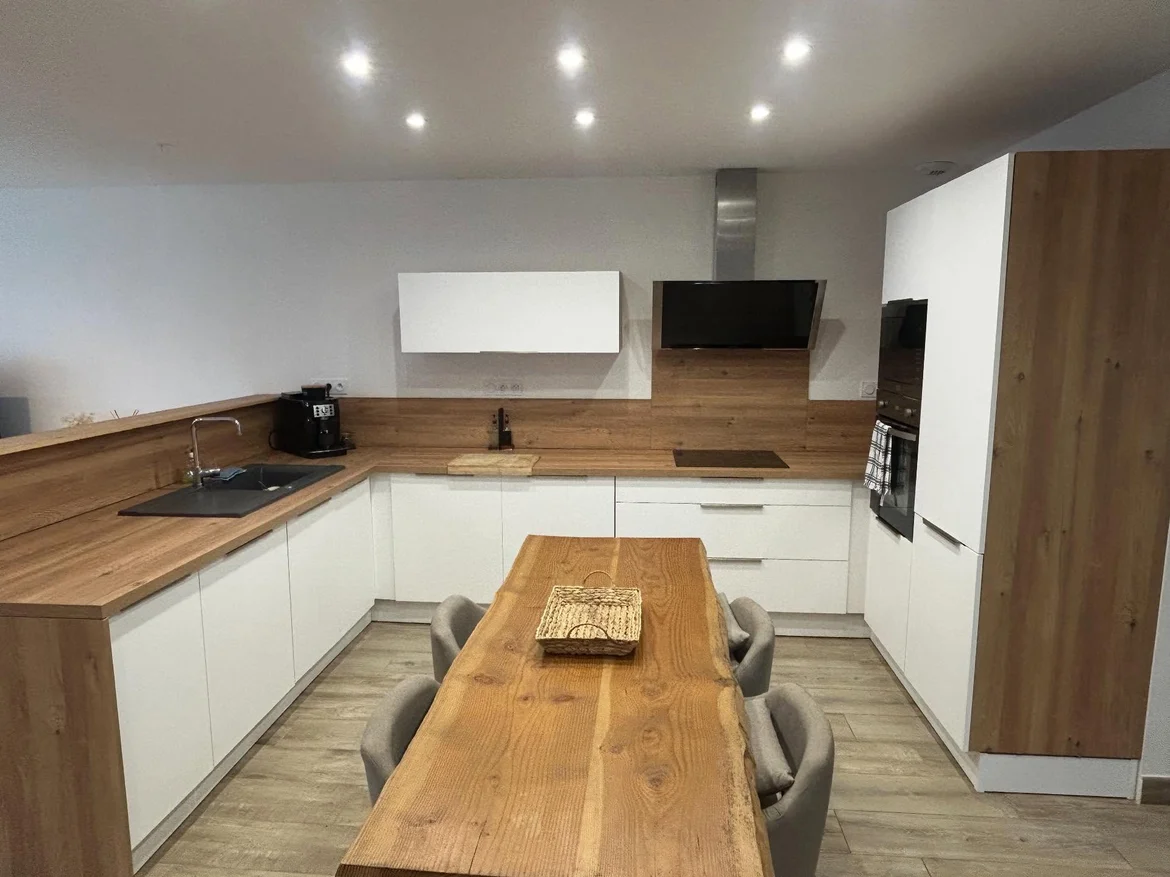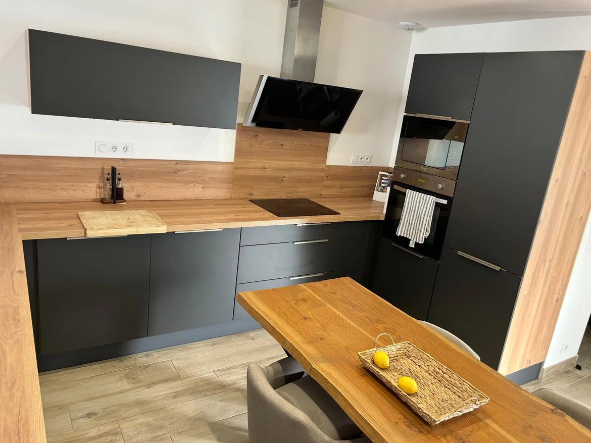 Preserved the warm wood countertops, backsplash, and tall-unit cladding. Their natural texture now stands out more prominently against the darker cabinetry, creating a harmonious warm–dark contrast. -