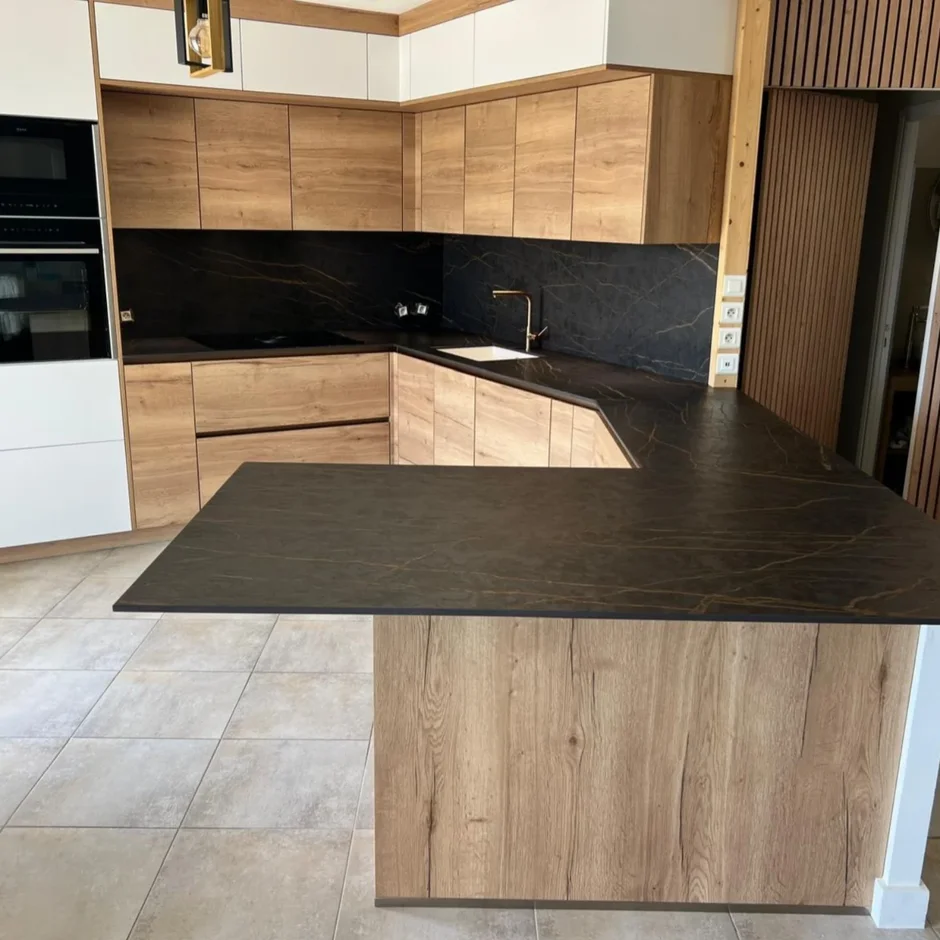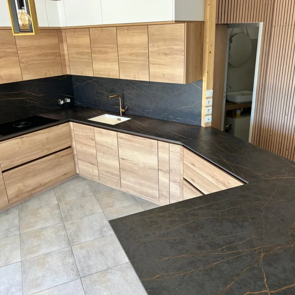 This kitchen renovation combines warm natural wood with dramatic matte-black stone to achieve a bold, modern aesthetic, creating a stylish and functional space.