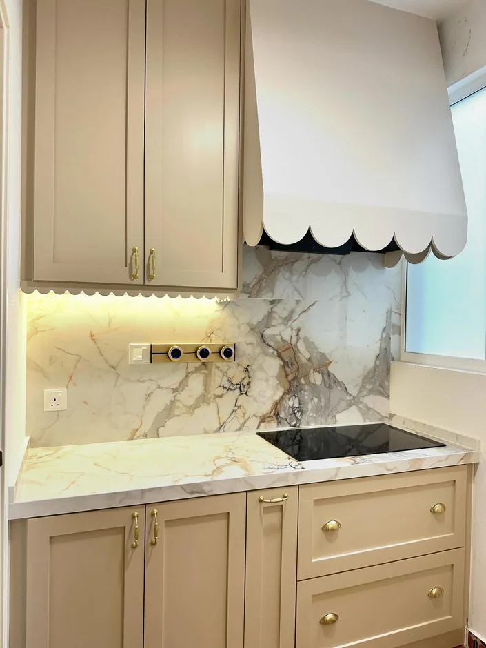 Added marble-look quartz countertops with rich veining, paired with a full-height splashback to create a continuous, luxurious visual flow. This surface is durable, easy to maintain, and adds a high-end focal point to the kitchen. -