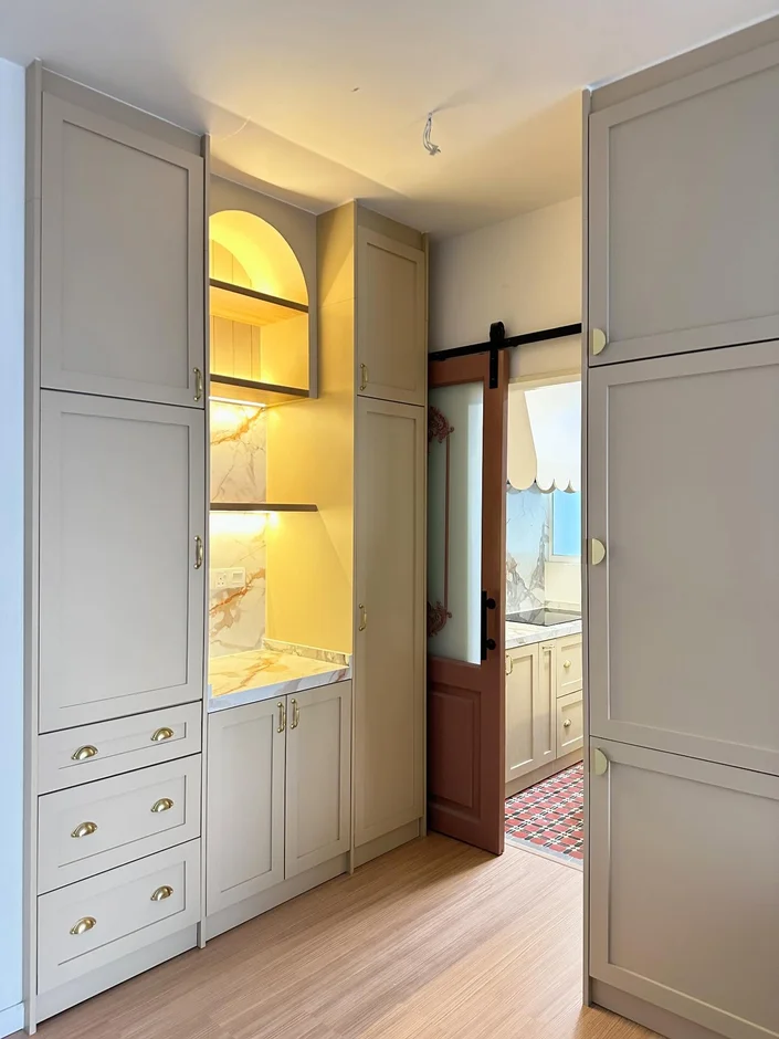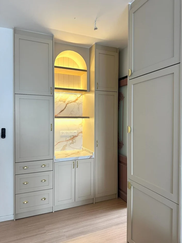 Built a custom arched display niche with warm LED lighting, adding both storage functionality and a stylish design highlight that elevates the overall aesthetic. -