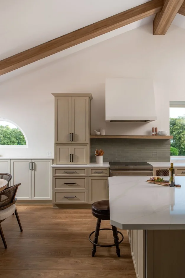 Decorative wood ceiling beams were added to emphasize the vaulted ceiling and add character to the open space. These elements bring warmth and architectural depth to the overall design.