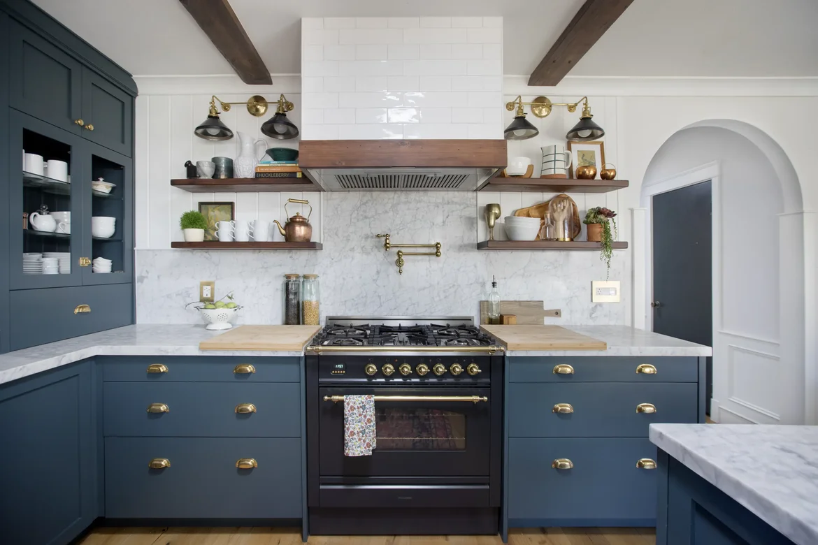 We built and installed deep-blue custom cabinets with solid brass hardware, offering both durability and an elevated aesthetic. -