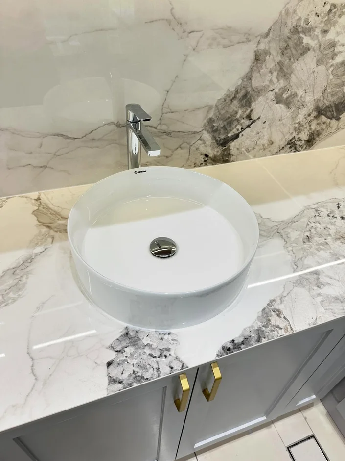 Fitted a sleek circular countertop basin paired with a minimalist chrome faucet for a polished, contemporary appearance. -