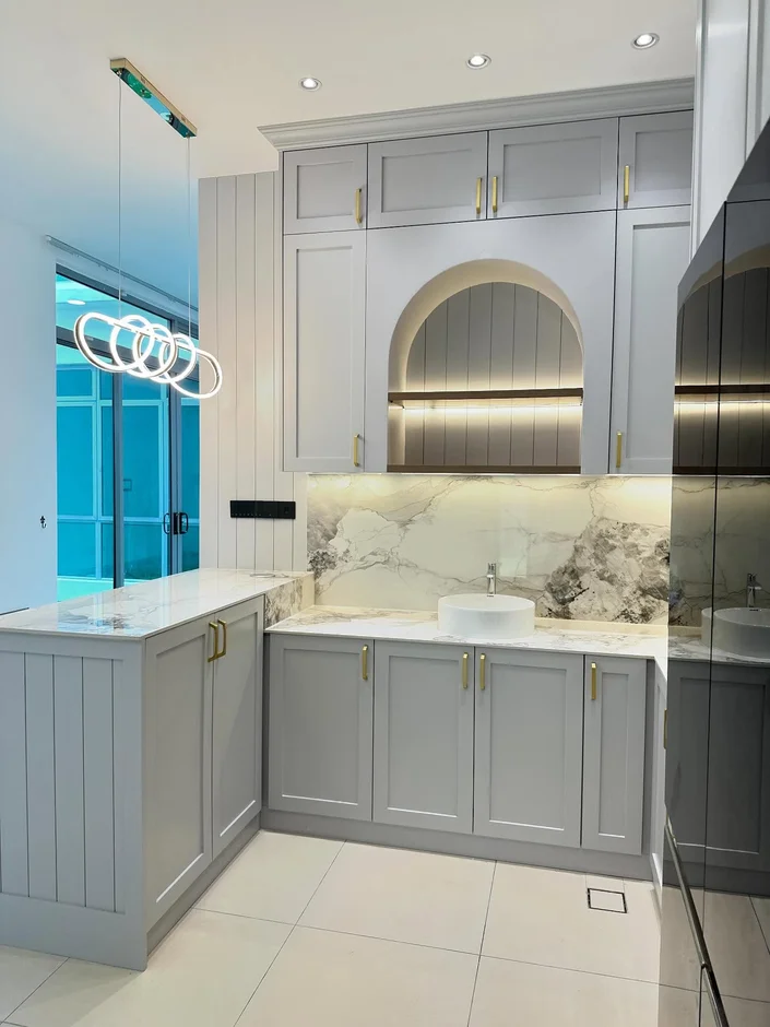 This kitchen renovation blends soft grey cabinetry with luxurious marble textures, creating a calm, elegant, and highly functional cooking space. Warm lighting, refined gold hardware, and thoughtfully integrated storage elevate both the aesthetics and practicality of the room.