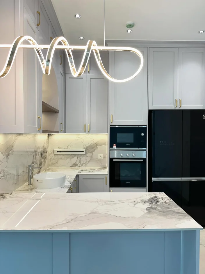 Installed a sculptural LED pendant and warm under-cabinet lighting to enhance countertop visibility and introduce soft ambient illumination throughout the workspace. -
