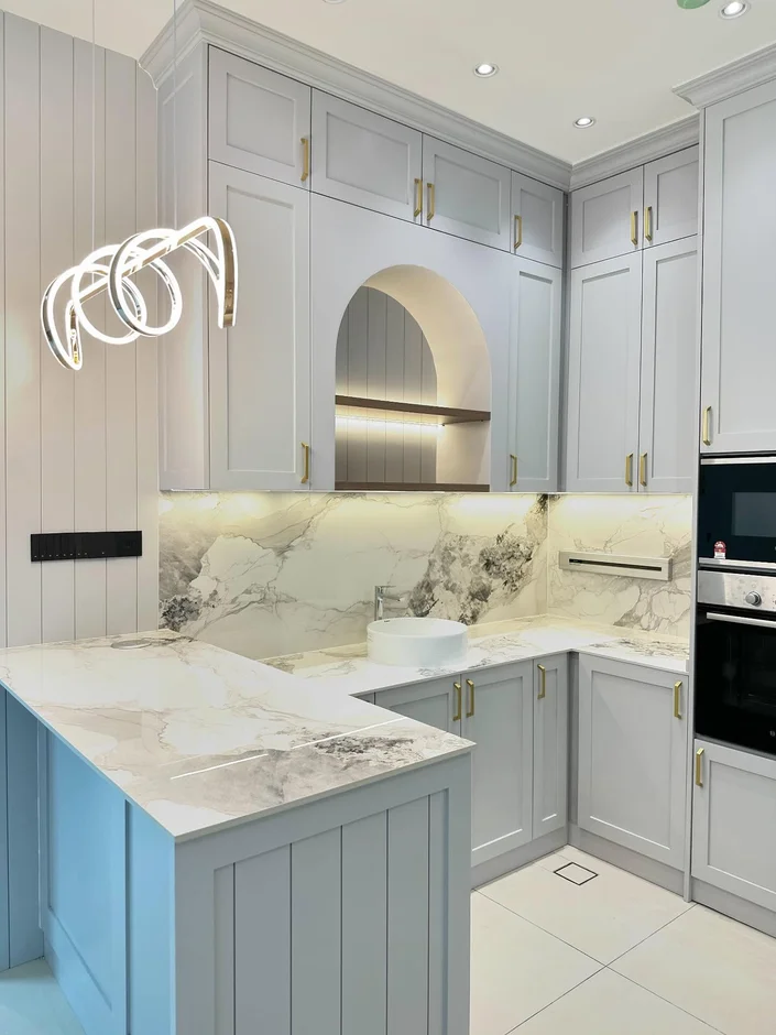 Built a decorative arched niche with built-in lighting, designed to serve as a functional display area while adding architectural charm to the cabinetry layout. -