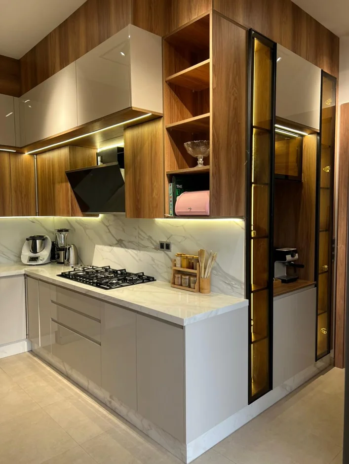 This kitchen renovation combines modern elegance with the warmth of natural textures. Glossy light cabinetry keeps the space bright and streamlined, while rich wood panels add depth and coziness. Marble-effect surfaces and layered LED lighting create a sophisticated, high-end atmosphere that is both functional and inviting.