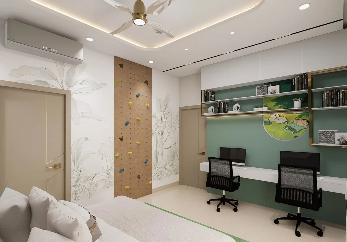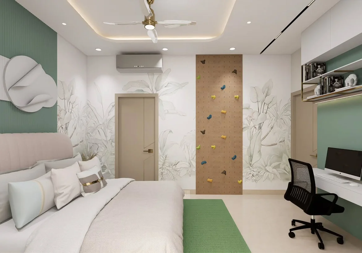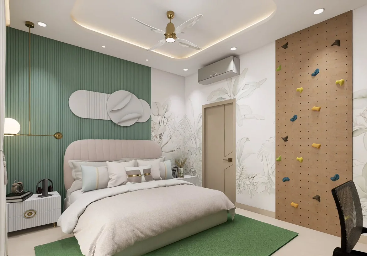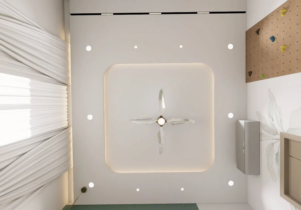 Added a safe and durable climbing wall that encourages movement and builds physical confidence. The natural plywood tones and colorful holds introduce playfulness while blending harmoniously with the room’s calm color palette. -