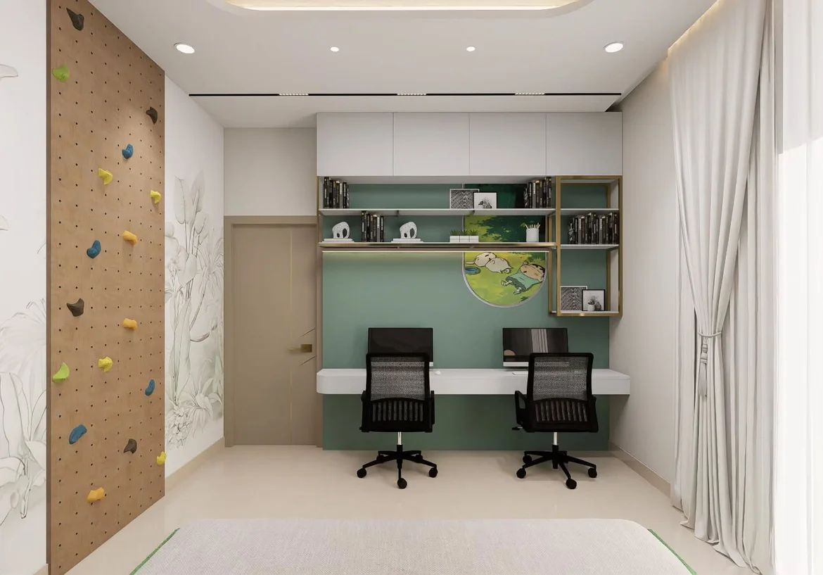 Built a spacious two-person study desk with integrated shelving to support focused learning and organized storage. Open and closed cabinets help keep school materials tidy, while the mint-colored backdrop adds freshness and energy to the study zone. -