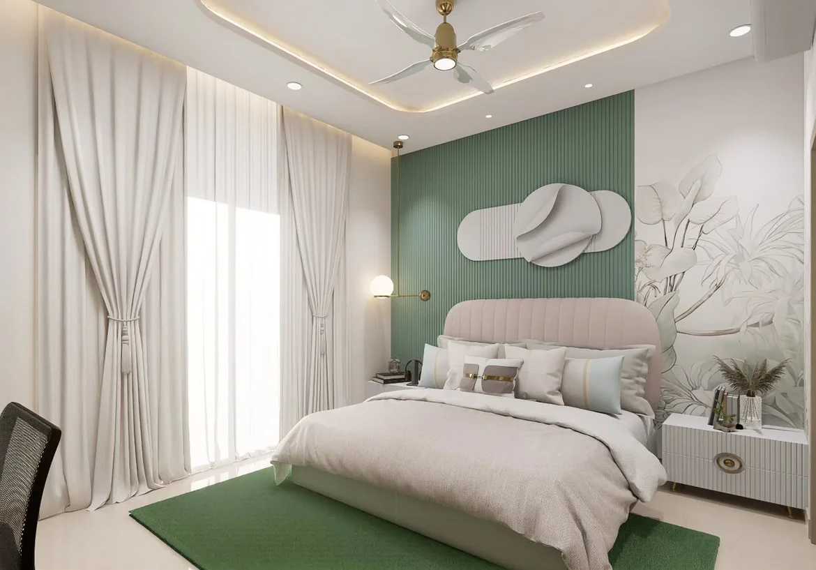 Installed a vertical green panel wall behind the bed to introduce depth, color, and texture while maintaining a calm, nature-inspired feel. Custom sculptural decor adds a focal point that elevates the room without overwhelming the space. -
