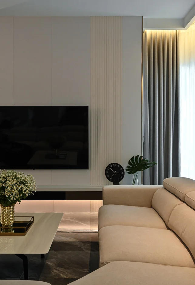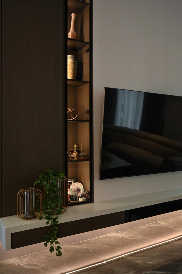 A full-height custom media wall was constructed, including a wall-mounted TV area, concealed storage cabinets, and open vertical display niches. The built-in unit was securely anchored to the structure and finished with durable materials suitable for long-term residential use.