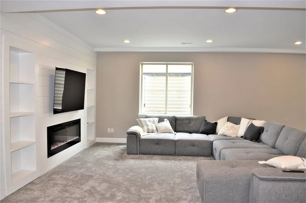 Decorative wall panels were installed behind the television to create a defined media wall. Built-in shelving units were constructed and integrated into the wall for storage and visual symmetry.