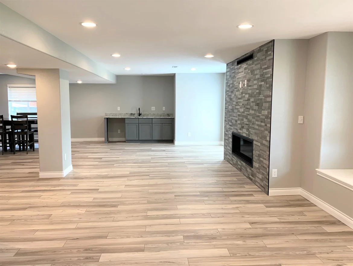 For this basement renovation, our team delivered a complete transformation that turned an outdated lower level into a bright, modern, and highly functional living space. The project included full surface upgrades, improved lighting, a custom fireplace feature, and a new wet bar to create a comfortable and versatile environment for relaxation and entertaining.