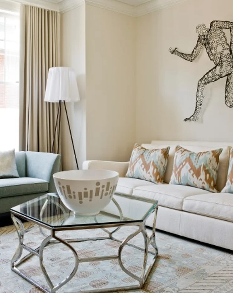 Artful accessories: bold abstract wire sculpture on the wall, fresh pink floral centerpiece, glass coffee table with decorative bowl, and contemporary abstract artwork.