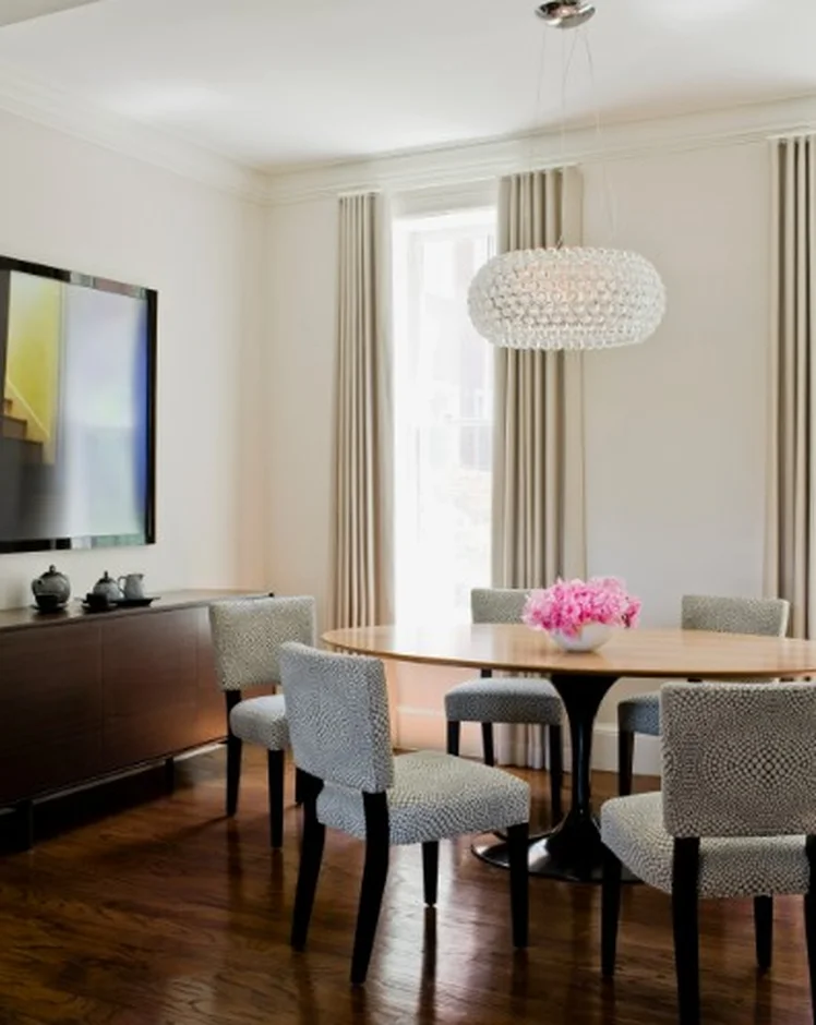 This sophisticated open-plan living and dining room exemplifies transitional style at its finest — seamlessly merging traditional elegance with clean, modern lines. Neutral walls and rich hardwood floors create a warm, timeless backdrop, while carefully curated furnishings and accessories add layers of texture, subtle pattern, and organic touches.