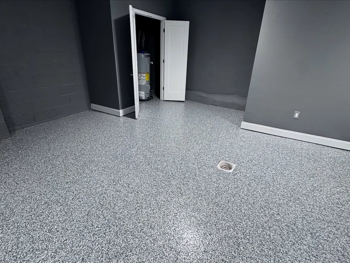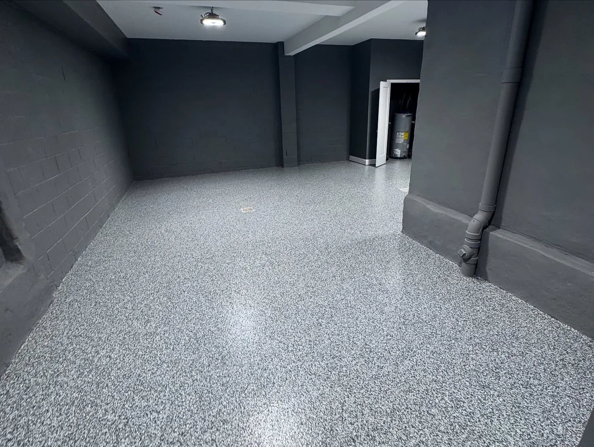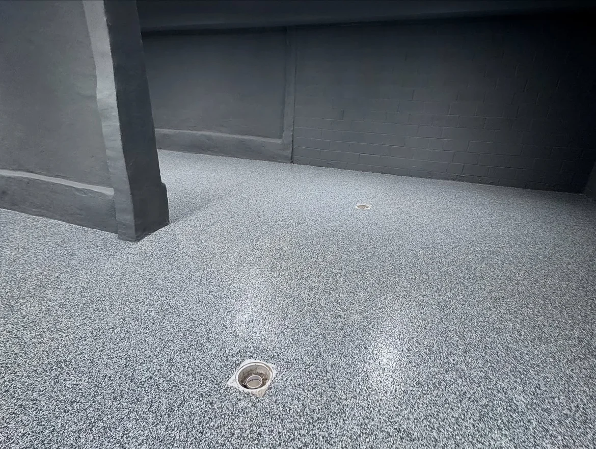 The floor renovation features a seamless decorative epoxy system with a flake finish, designed to deliver durability, moisture resistance, and a clean, modern appearance. This solution is ideal for high-traffic and utility spaces where long-term performance and easy maintenance are essential.