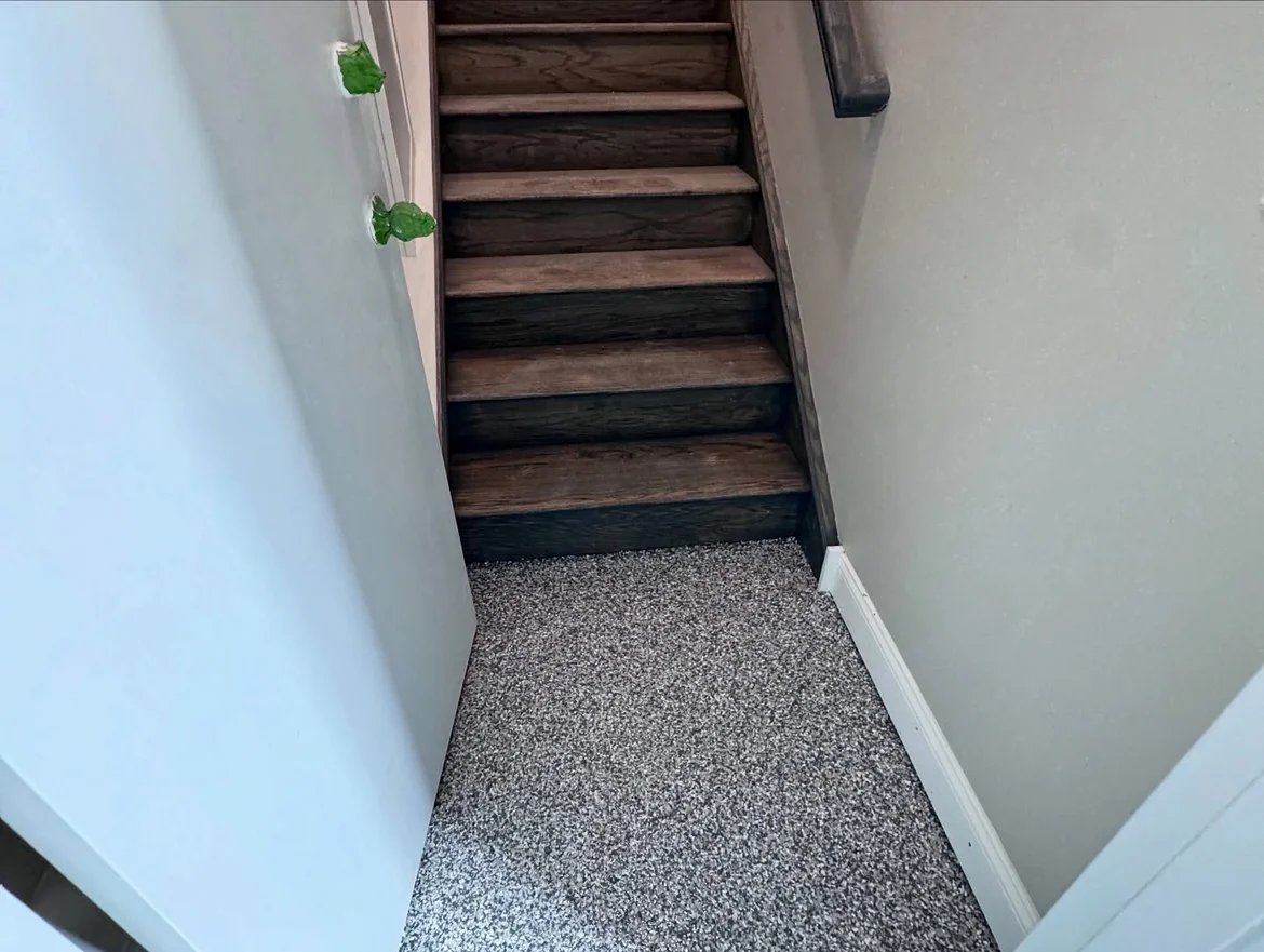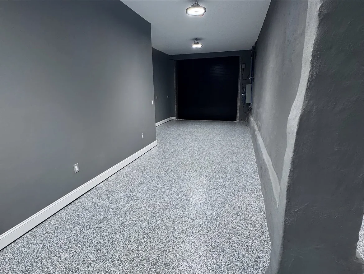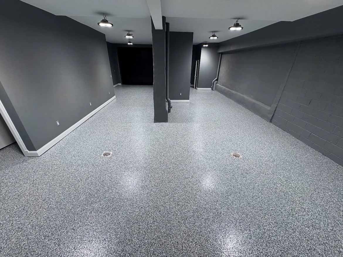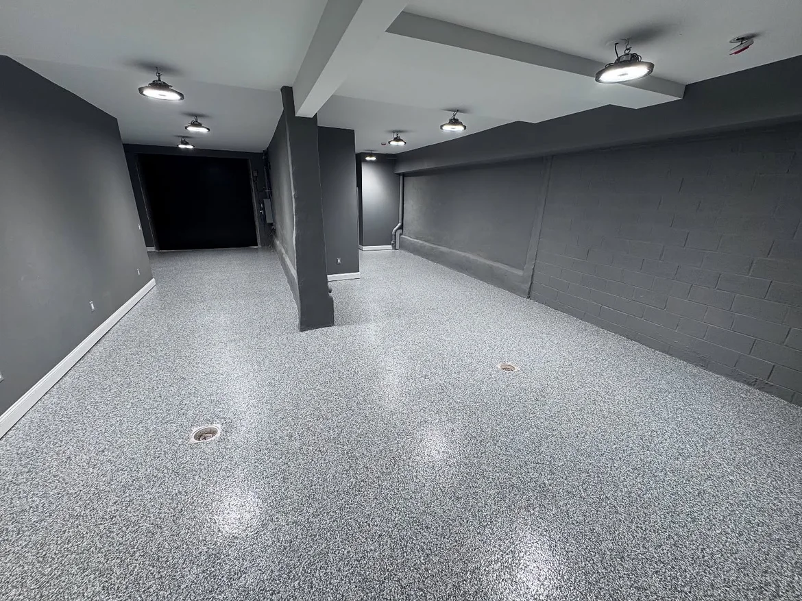 The floor renovation features a seamless decorative epoxy system with a flake finish, designed to deliver durability, moisture resistance, and a clean, modern appearance. This solution is ideal for high-traffic and utility spaces where long-term performance and easy maintenance are essential.