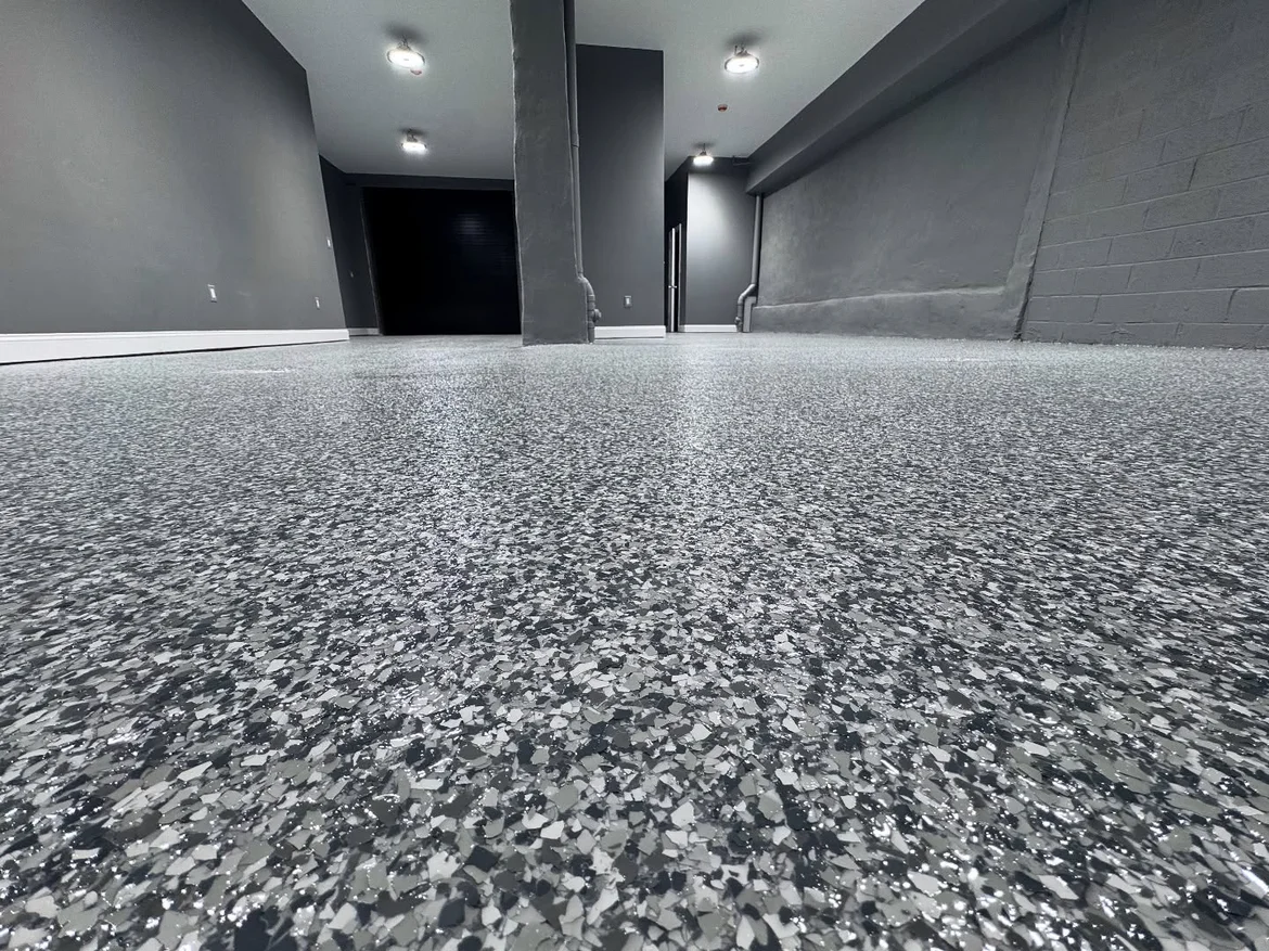 Broadcasted multi-tone gray and white decorative flakes evenly across the surface, providing texture, slip resistance, and visual depth while concealing minor dirt and wear. -