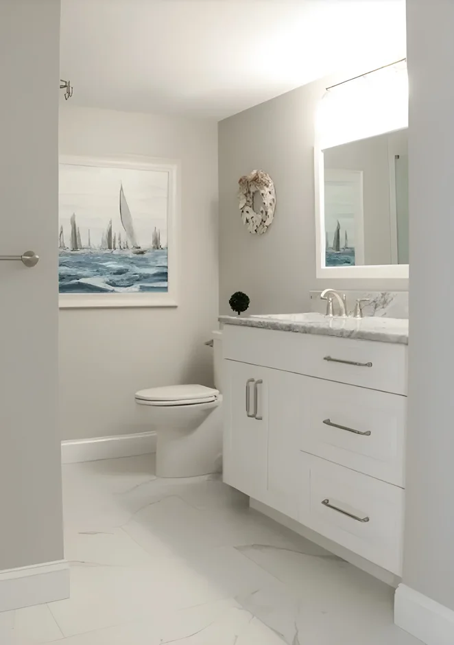 The once dull and cluttered bathroom was reimagined with a sleek marble vanity, modern fixtures, and ample storage. Soft lighting and a large mirror amplify the sense of space, turning it into a luxurious oasis.