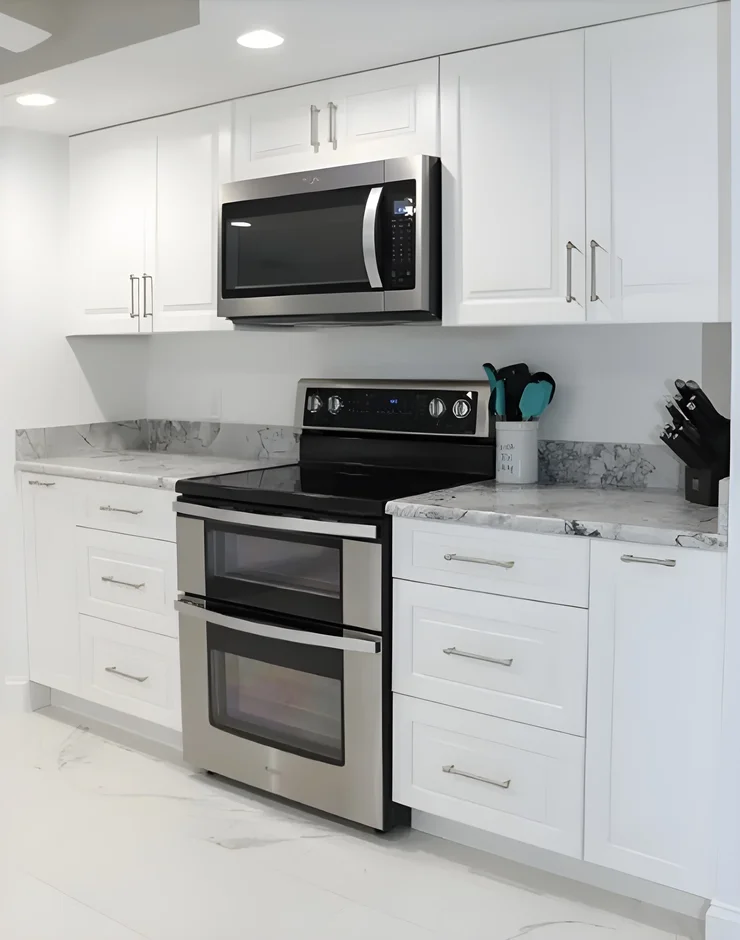 The cramped kitchen was opened up with white cabinetry and marble countertops, creating a spacious, contemporary cooking area. Modern stainless steel appliances and smart storage solutions make the space both stylish and practical.