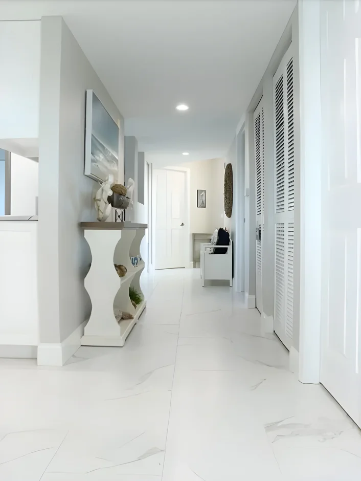 The hallway now features seamless marble flooring that guides visitors through the condo. Minimalist decor and white walls keep the space bright and welcoming, enhancing the coastal vibe.