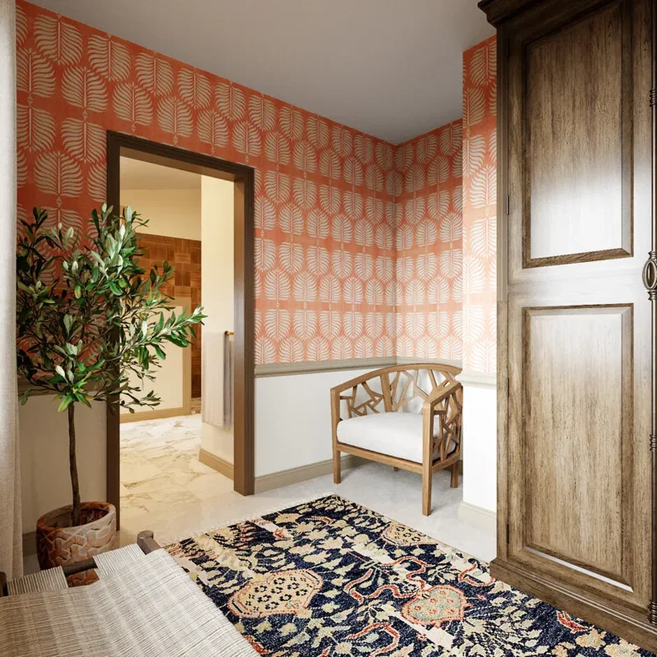 Introduced statement wallpaper in a terracotta-and-cream leaf pattern to add personality and movement.