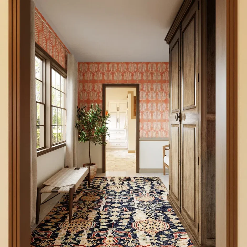 The hallway now feels curated and welcoming: bold but balanced, practical but elevated. The mix of pattern, wood tones, and clean trim creates a modern eclectic look that guides you through the space while making the entry experience feel finished and inviting.