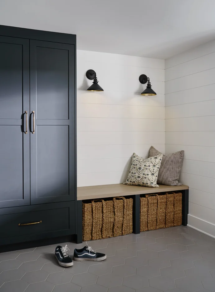 To complete the renovation, the space was styled with decorative pillows and functional storage baskets. The finished mudroom now offers a perfect balance of practicality, comfort, and modern design.