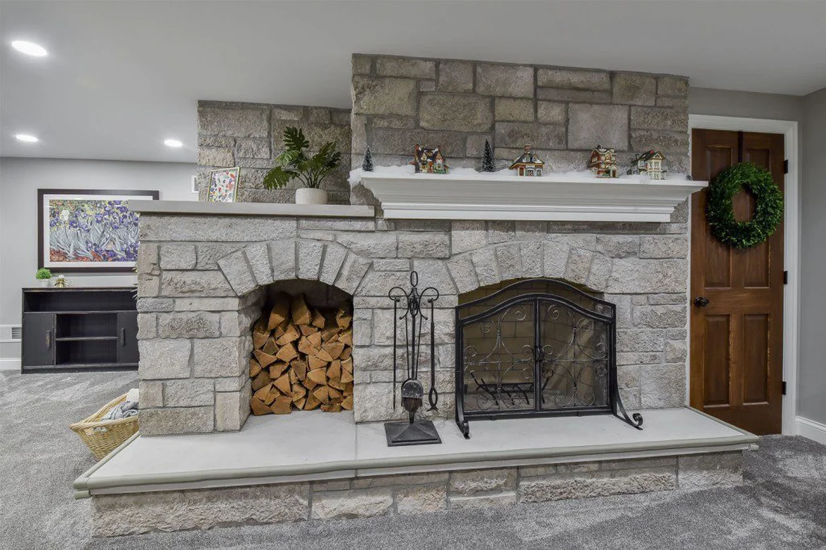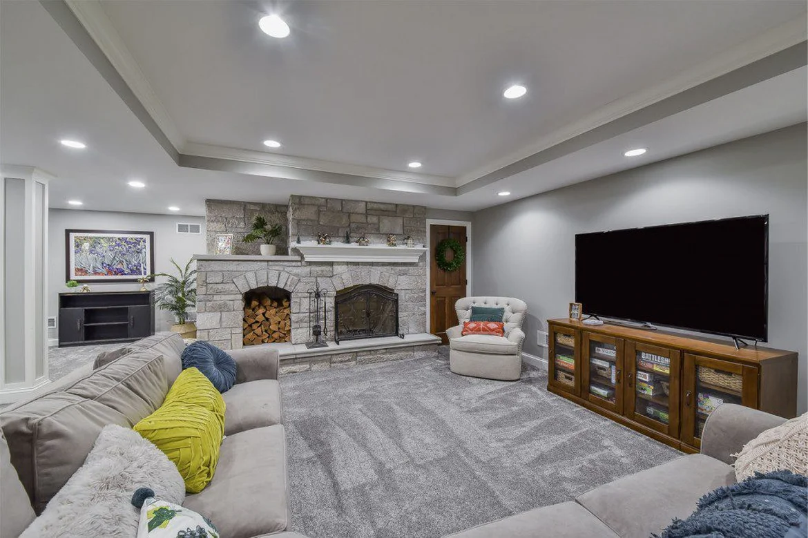 A stunning stone fireplace became the centerpiece of the renovated basement. The updated living area now includes: