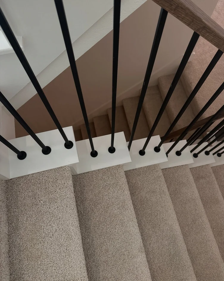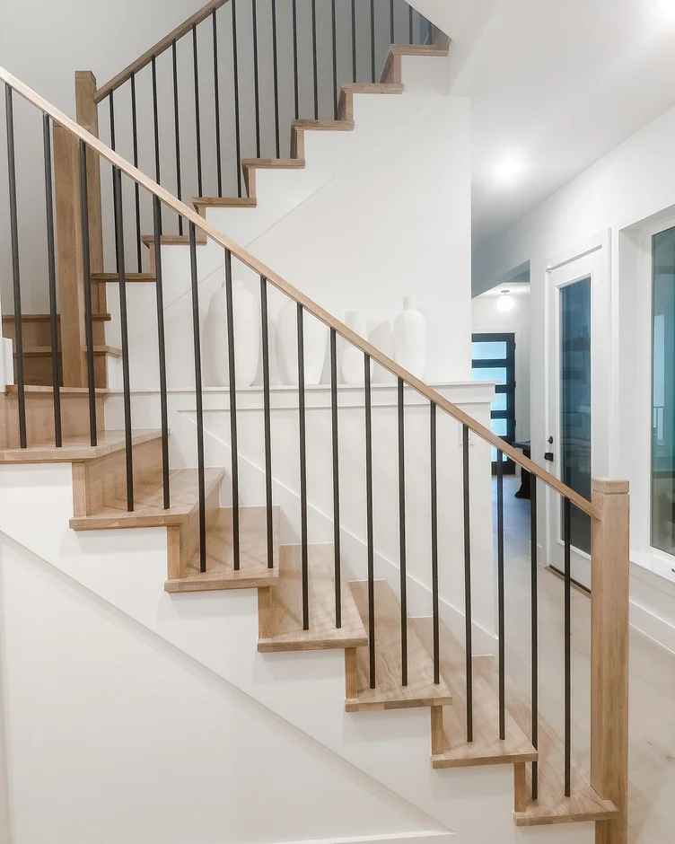 Added slim black metal balusters to maintain safety while preserving an open, airy appearance throughout the stairwell. -