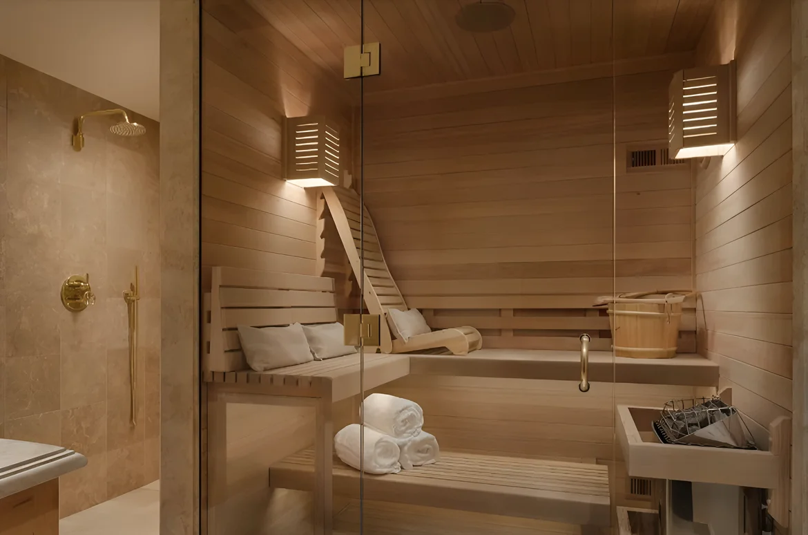 Built a custom cedar-lined sauna with tiered benches, ergonomic recliner, traditional bucket and ladle, heater with stones, glass door, and ambient wall sconces.