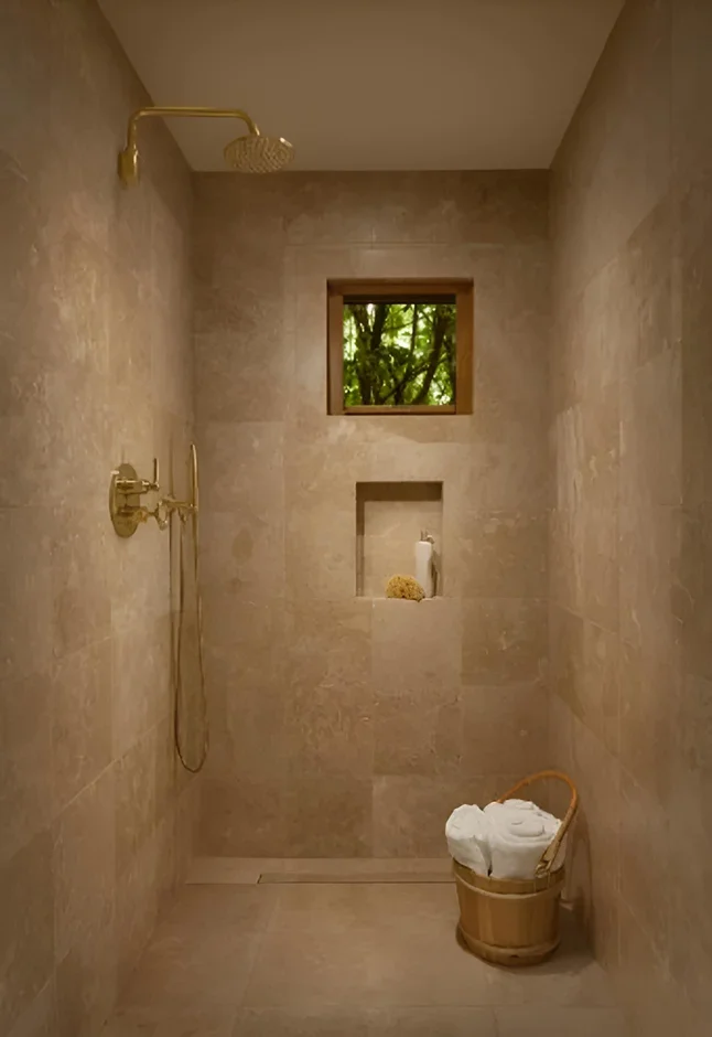 Used matching travertine-style tiles on walls and floors for seamless flow between shower and overall space.