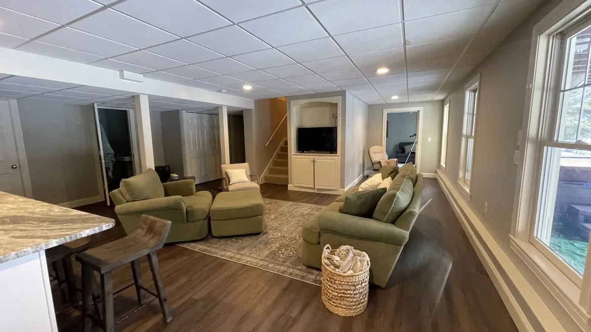 The basement now feels finished and welcoming — an easygoing space for movie nights, guests, or casual entertaining, with practical upgrades that keep the design simple.