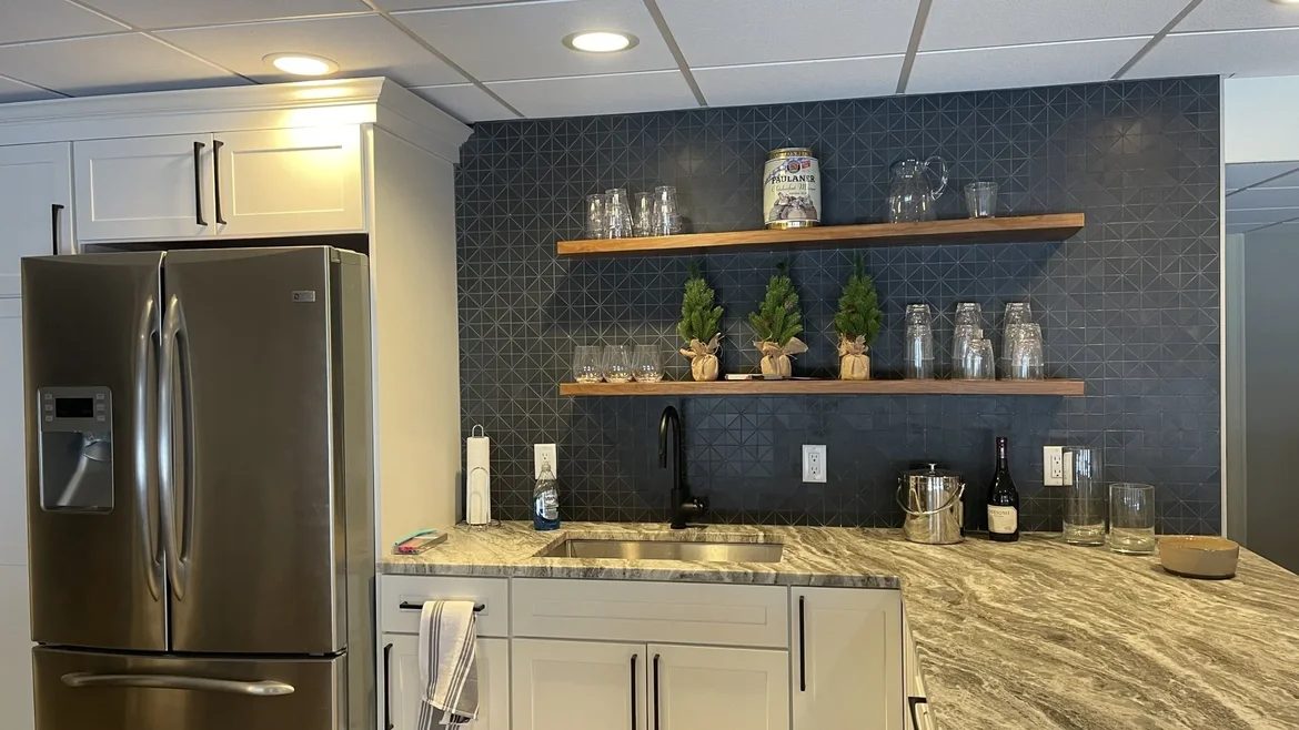 Added a compact bar/kitchenette area with fresh cabinetry and a durable countertop.