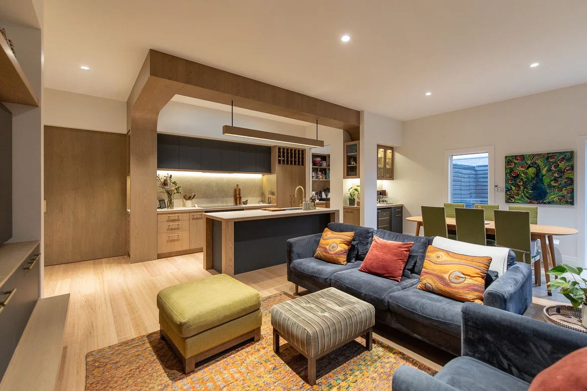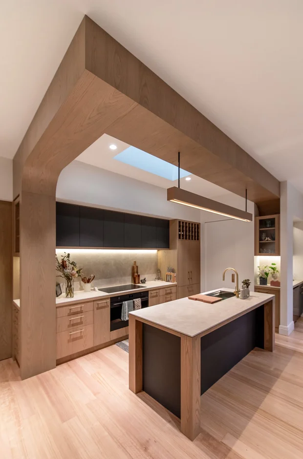 Designed a structural wood-framed opening with elegant curved corners that visually unifies the kitchen and living areas, adding architectural warmth while creating a striking focal point in the open-plan layout. -
