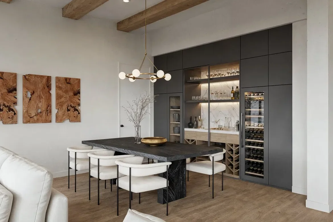 This project started as a raw, under-construction shell and ended as a calm, bright great room with a dining area that feels intentional—not just “a table in a corner.” We focused on clean lines, warm textures, and a layout that supports real life: everyday meals, hosting, and relaxing in the same space without visual clutter.